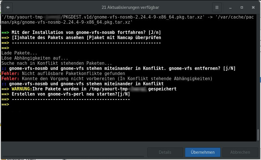Aktualisierung lief reibungslos durch,If you get a conflict between gnome-vfs and gnome-vfs-nosmb, please proceed as follows (assuming you use yaourt as AUR helper, otherwise exchange the command to that of your AUR helper):