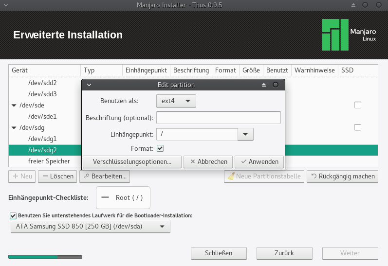 mit Gpartet 4 GB für swap und den Rest für Manjaro